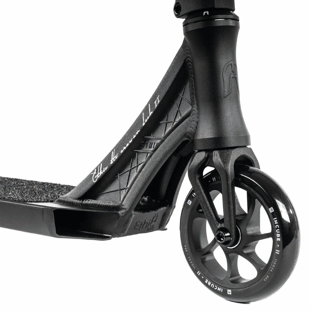 Der Ethic Erawan V2 besticht nicht nur durch seine technischen Eigenschaften, sondern auch durch sein modernes und ästhetisch ansprechendes Design. Die hochwertige Verarbeitung und das markante Branding machen diesen Freestylescooter zu einem Blickfang auf der Strasse und im Skatepark.