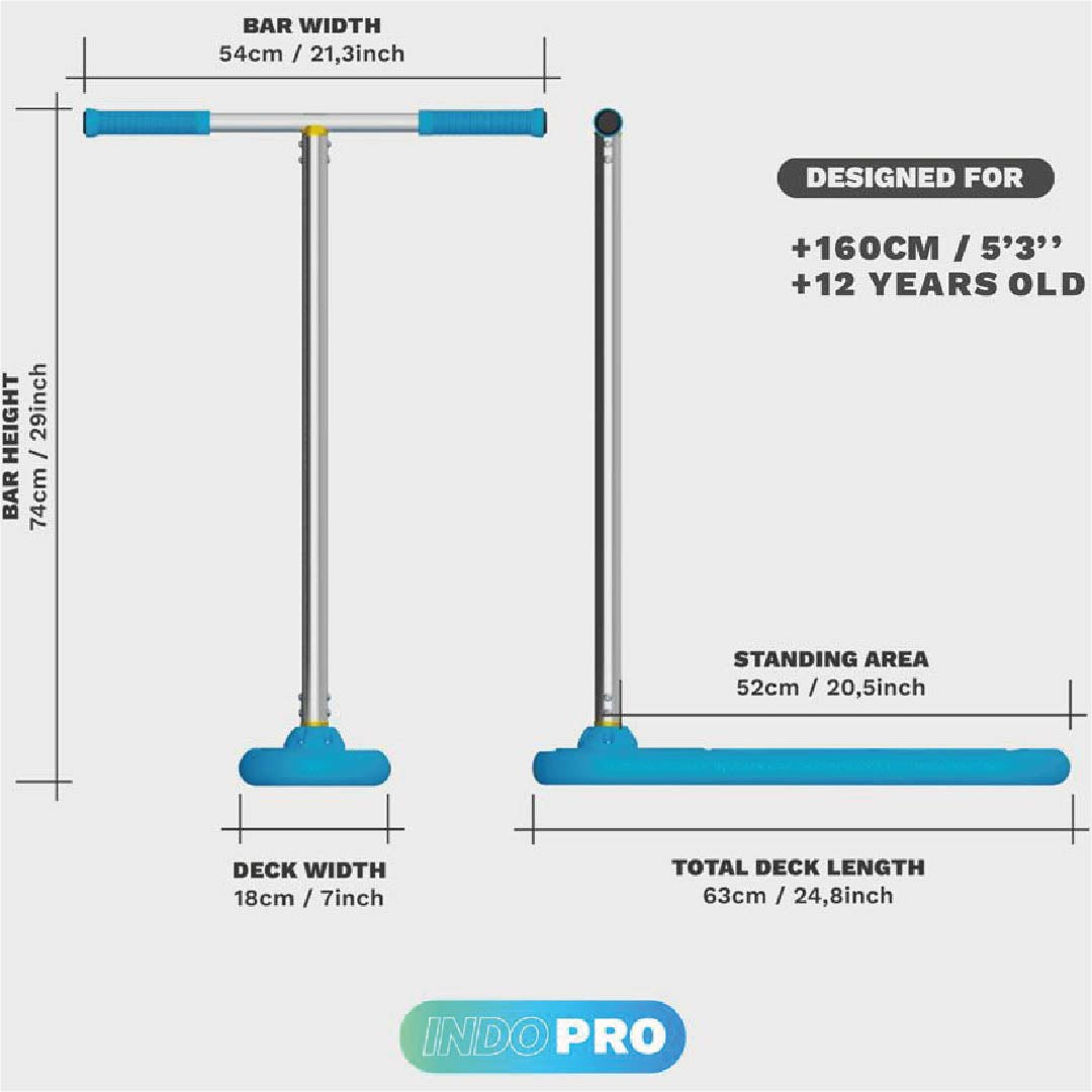 Der INDO pro ist der perfekte Trick-Scooter für fortgeschrittene Fahrer, um ihre Tricks zu perfektionieren. Er bietet mehr Kontrolle als die X70-Modelle dank des ultraschnellen INDO-Kompressionssystems, der größeren Größe und des höheren Gewichts sowie der besseren Gewichtsverteilung. Er ist für Trampoline und Innenräume geeignet.